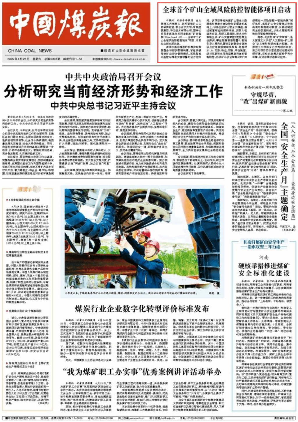 4月26日,《中国煤炭报》第1版以《全球首个矿山全域风险防控智能体项目启动》为题对公司全球首个“矿安智脑”项目启动会进行报道。现将全文转载如下。