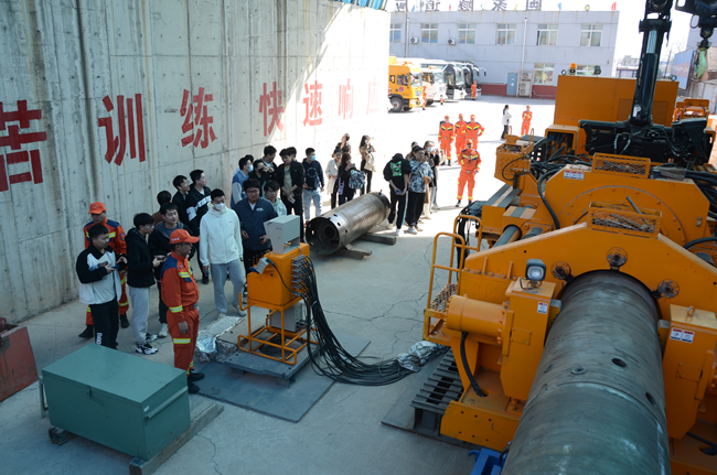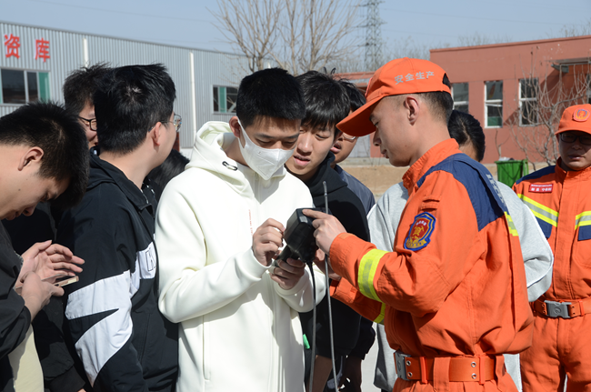 “这是隧道关门塌方事故救援利器——大口径水平钻机,内外管可单独驱动,作业稳定、直进性好,钻进效率高,排渣顺畅,运用套管钻进作业可快速打通逃生管道……”隧道救援太原队常务副队长带领师生们参观了装备库,详细讲解大口径水平钻机、多功能快速钻机、顶管机等各类专业救援装备的性能和用途。师生们在救援队员手把手指导下,体验操作音视频生命探测仪、红外热成像仪、蛇眼生命探测仪等小型救援设备,零距离感受应急救援科技创新魅力。