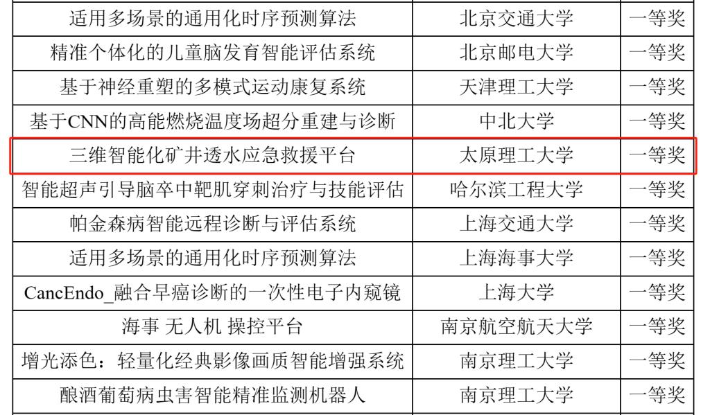 9月22日至9月24日,“华为杯”第五届中国研究生人工智能创新大赛全国总决赛在山西太原举行,经过初赛、决赛的激烈角逐,公司研究生郁静静、杨天艺、朱登奎、胡嘉奇的参赛项目《三维智能化矿井透水应急救援平台》获得全国一等奖,公司谢彪、张兴华两名教师荣获优秀指导教师奖。这是公司首次在研究生人工智能创新大赛获得全国一等奖,实现了此项赛事上的新突破。