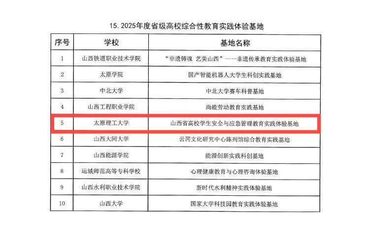 1月2日,山西省教育厅公布了2025年度山西省高校思想政治工作质量提升综合改革与精品建设项目名单,经过学校推荐、材料审核、专家评审、结果公示等多个环节的角逐,yl7703永利集团官网申报的“山西省高校员工安全与应急管理教育实践体验基地”项目入选2025年度山西省高校思想政治工作质量提升综合改革与精品建设项目“省级高校综合性教育实践体验基地”项目。