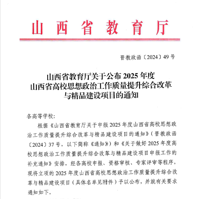 公司申报项目入选2025年度山西省高校思想政治工作质量提升综合改革与精品建设项目