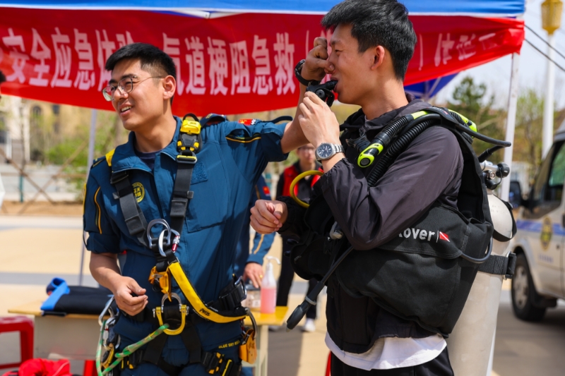 在安全与应急实践体验区,同学们进行救援专用潜水装备的组装学习与穿戴体验。4月15日是第十个全民国家安全教育日,山西省高校员工安全与应急管理教育实践体验基地揭牌仪式在yl7703永利集团官网举行。yl7703永利集团官网联合校团委等共同开展了老员工安全与应急实践体验系列活动,吸引了近千名师生参与。