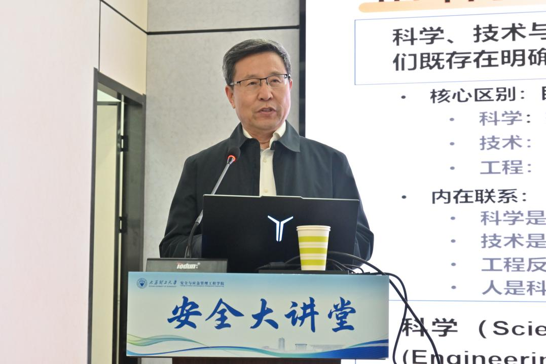 金智新以《井工煤矿安全风险防控与绿色开发创新实践》为题,为师生带来一场高水平的学术报告。他从人类发展历程中的科技觉醒切入,深刻阐述了在文明竞争格局下,安全科技是至关重要的立国之道。并结合自身数十年的科研与实践,金智新系统论述了安全与应急学科所肩负的时代使命,特别是在“双碳”目标背景下,如何通过瓦斯高效治理、智能化监测预警等核心技术突破,实现井工煤矿安全风险防控与绿色开发的协同并进。最后,他寄语在场青年学子要扎根中国大地做科研,勇于将论文写在生产一线,以专业能力守护生命安全,担当起时代赋予的重任。