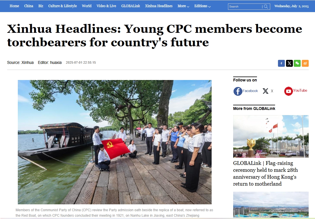 7月1日,新华社英文版头条对公司党委工作和优秀青年党员邓文浩事迹进行报道,现将原文转载如下: