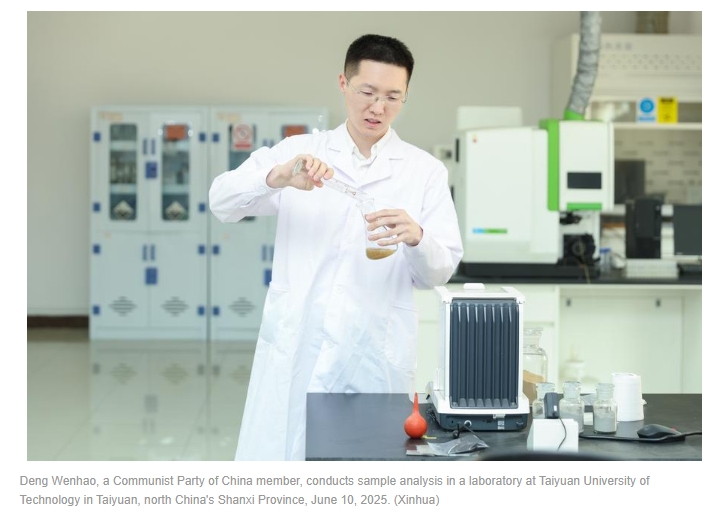 Deng Wenhao, a Communist Party of China member, conducts sample analysis in a laboratory at Taiyuan University of Technology in Taiyuan, north China's Shanxi Province, June 10, 2025. (Xinhua)